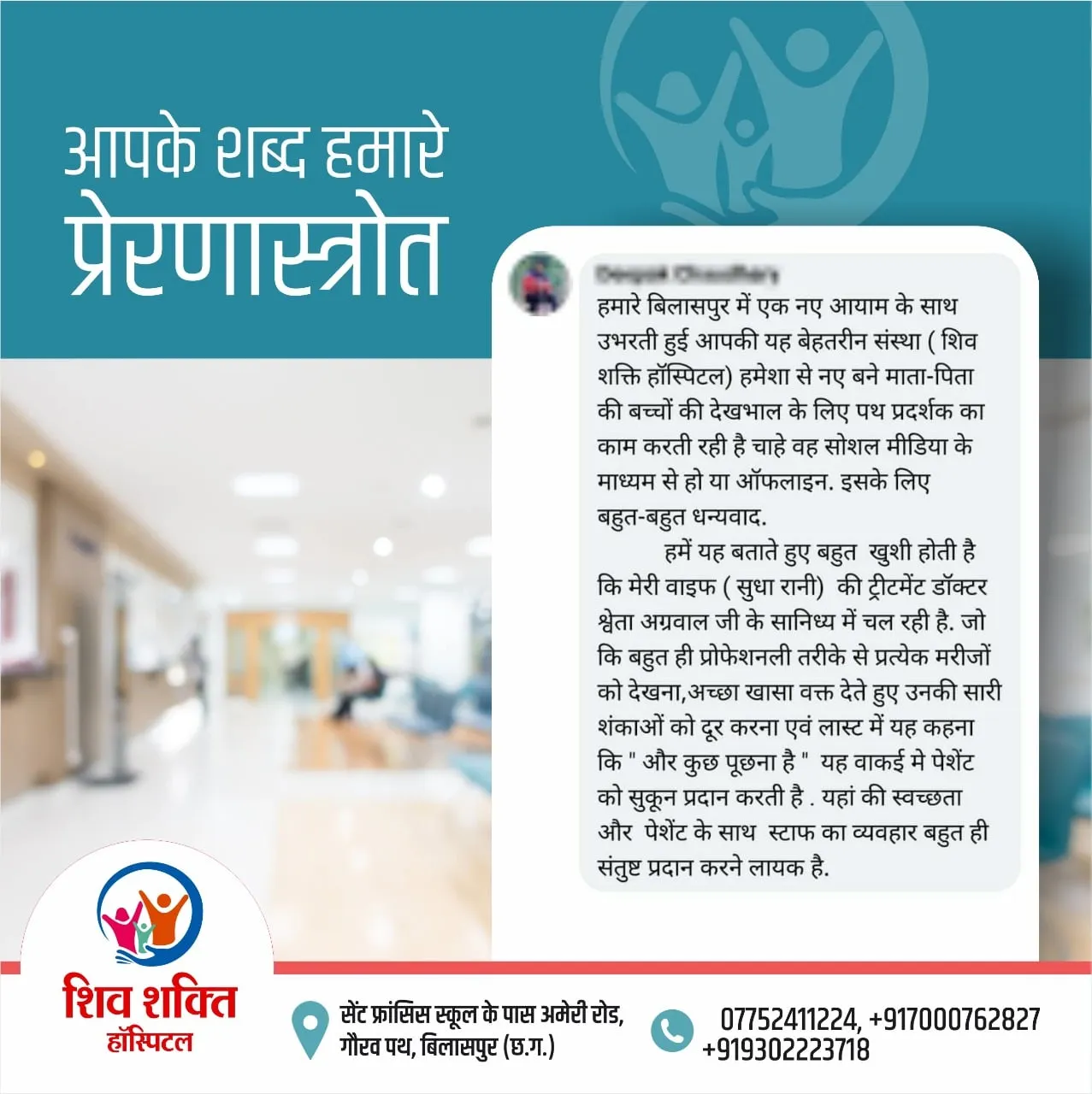 We extend our deepest gratitude to all of you for choosing Shiv Shakti Hospital for your healthcare needs. Your trust in our services motivates us to strive for excellence and deliver personalized care with empathy & love